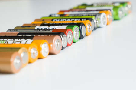 BOBRUISK, BELARUS 17.08.2020: Many multi-colored batteries AA and AAAon a white background