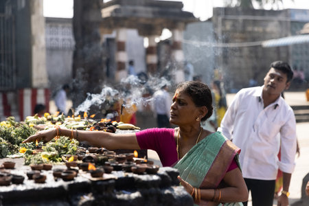 January 11, 2023, in South India, pilgrims visit an ancient Hindu temple during the night.