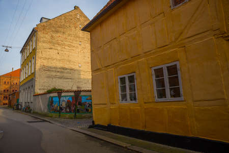 Helsingor, Denmark, Europe: Beautiful graffiti on the wall. Street view with colorful buildings in Elsinore, Denmark.