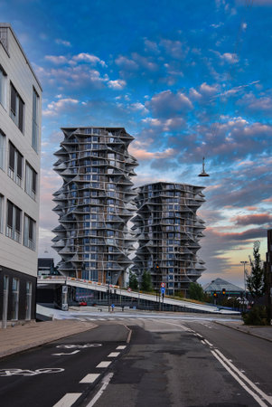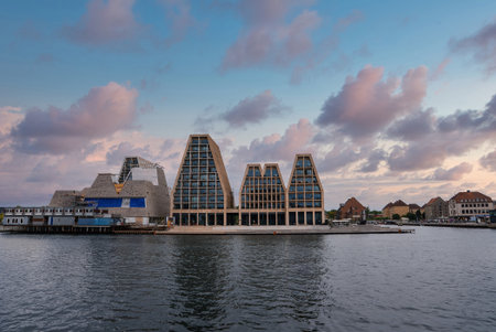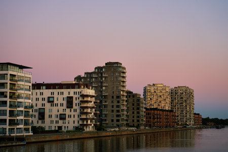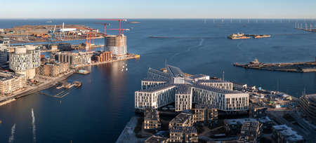 Modern residential buildings along waterfront in Copenhagen, Denmark. Contemporary Scandinavian architecture. Panoramic view of city at sunset
