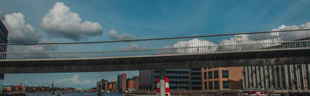 Panoramic shot of bridge with buildings and cloudy sky at background in Copenhagen, Denmark