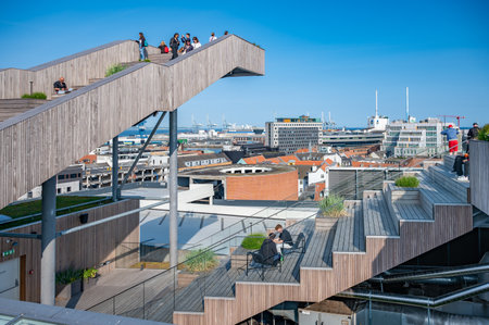 Salling ROOFTOP Roof Garden at Aarhus, Denmark with tourists sitting on a staircase, wide angle shot