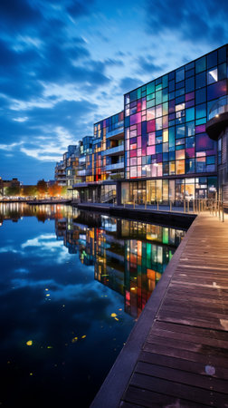 Modern colorful glass facade of an apartment building reflecting in the water at dusk