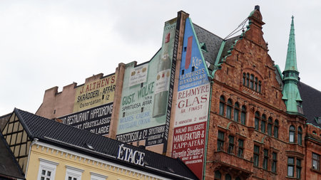 MALMO, SWEDEN - MAY 31, 2017: Palaces that overlook the square Stortorget with some vintage advertisings, Malmo, Sweden