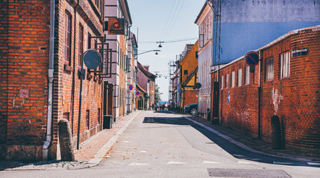 An empty street, traditional and modern houses. Sweden. Architecture, exterior design concepts. Panoramic view, cityscape