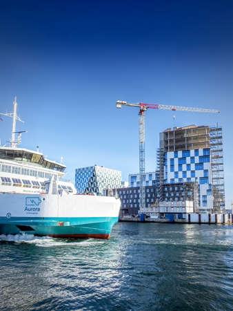 HELSINGBORG, SWEDEN - MARCH 08,2021: Aurora the battery powered passanger and freight ferry sails into Helsingborg harbour in Sweden.