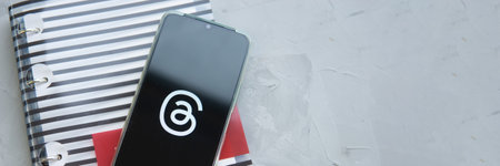 Tver, Russia - July 15, 2023, threads logo on the smartphone screen, on a gray background. The threads icon. The logo of the current application. Threads social network.