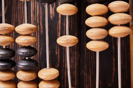 Close up of abacus calculate mathematic vintage object collection on the wooden table, flat lay