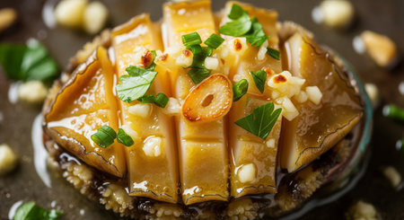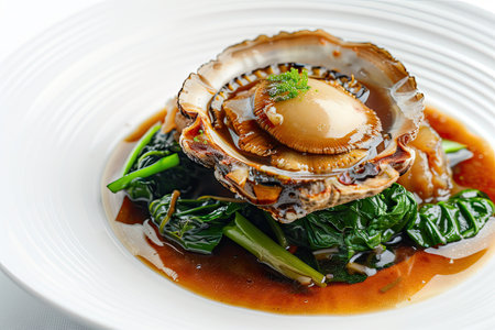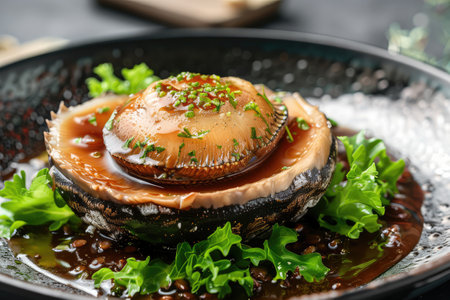 Cooked Abalone Dish, Scallops in Luxury Restaurant, Cooked Seashells, Australian Abalone in Sauce with Greens, Generative AI Illustration