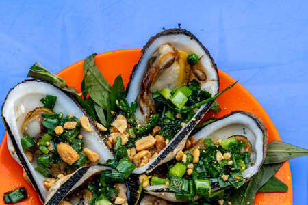 Grilled mussels served with peanut and green onion - Vietnamese cuisine
