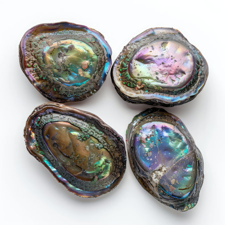 A macro shot reveals the mesmerizing interior of an abalone shell, showcasing its pearlescent layers, swirling patterns, and vibrant iridescent colors.