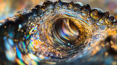 A detailed view of a sea shell covered in water droplets, Macro view of colorful sea shell spiral, AI Generated