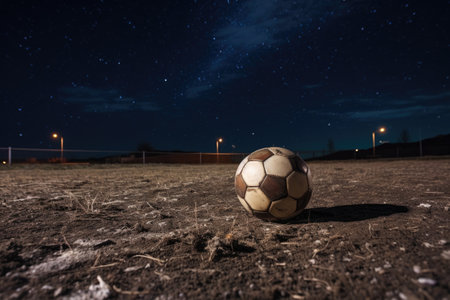 a football left behind on a deserted sports field under the starry sky, created with generative ai