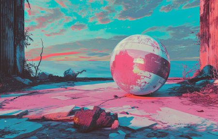 In the quiet solitude of an empty concrete skatepark, a crystal ball offers a unique and inverted perspective of the world.