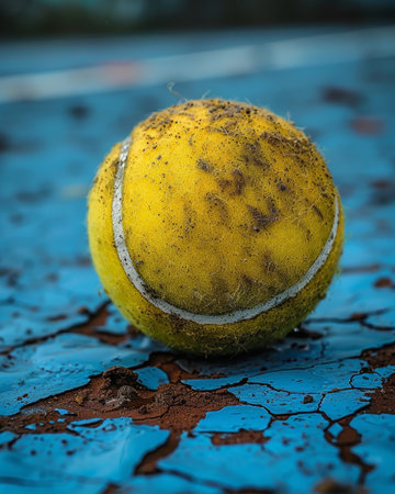 Old tennis ball covered in dust lying in the corner of a forgotten court