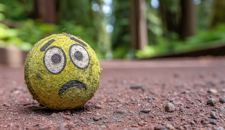 A worn yellow tennis ball featuring a sad face rests on a brown, textured surface. The image presents a forest background with a blurred trail. Soft lighting illuminates the scene. Suitable for illustrating concepts of disappointment or loss, it can also be used in various commercial applications.