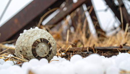 A lone, weathered snail shell rests on a bed of icy hailstones, a quiet testament to survival after a sudden storm.