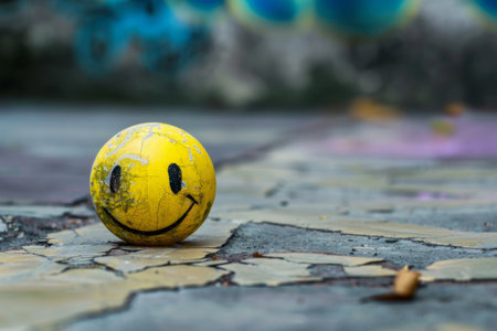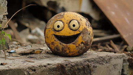 A smiling yellow ball covered in dirt is sitting on a concrete surface in a neglected outdoor space surrounded by debris.