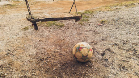 A close-up of a worn red and blue soccer ball resting on a dirty surface, reflecting the themes of neglect and abandonment in sports activities.