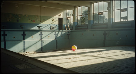 In a dimly lit corridor, a worn soccer ball lies neglected on the tiled floor, hinting at stories of past games and the laughter of youth. Shadows dance around, brushing against forgotten memories.