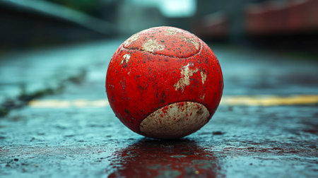 Worn-out red ball sitting on a wet street, capturing a nostalgic and moody atmosphere of childhood play.