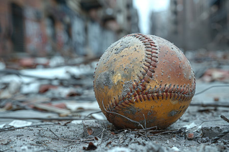 A solitary, weathered baseball rests in a bed of dusty ground, reflecting the passage of time and the essence of outdoor sports in nature.