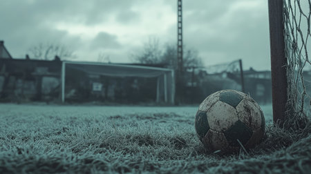 This serene outdoor scene features a lone soccer ball resting on frost-covered grass, with a distant goal under a cloudy morning sky, perfect for evoking tranquility.