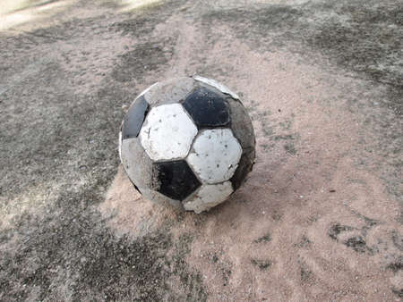 Old soccer ball placed on the field. Shabby football on the greensward.