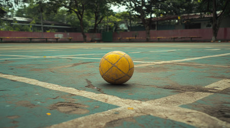 Sepak Takraw ball lying on an outdoor court with worn markings, capturing the spirit of the game.