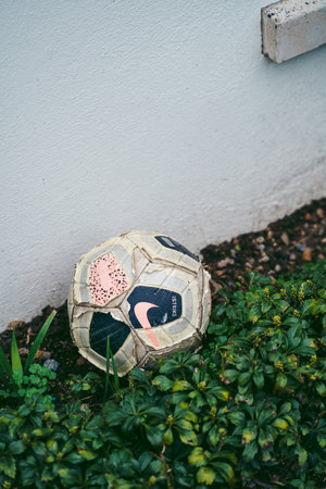 Jersey Island, Channel Island | UK - 2022.01.29: Old deflated football ball on the grass next to the house