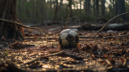a soccer ball rests amidst the serene beauty of a woodland setting, illuminated by the warm hues of a breathtaking sunset. captured with the artistic touch of ray collins using the panasonic lumix s pro 50mm f/1.4 lens, this photograph showcases a unique blend of decaying landscapes and the depiction of everyday life. the selective focus adds an intriguing element to this stunning composition. ai