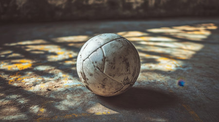 A close-up view of a weathered volleyball resting on an outdoor court, showcasing the interplay of sunlight and shadows on the textured surface, inviting active engagement and enjoyment.