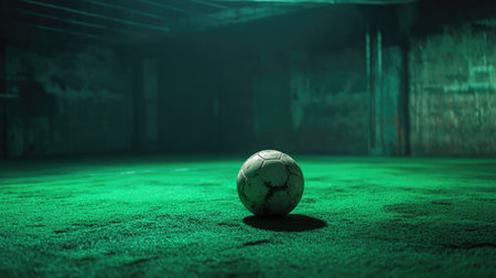 A vintage soccer ball rests on vibrant green turf in an abandoned indoor space, creating a dramatic and atmospheric scene filled with potential energy.