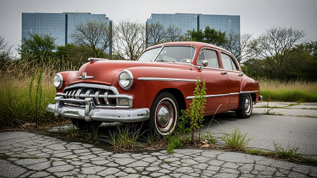 Classic red vintage car parked on cracked asphalt surrounded by overgrown weeds and modern buildings