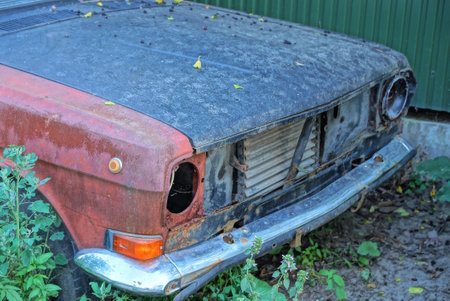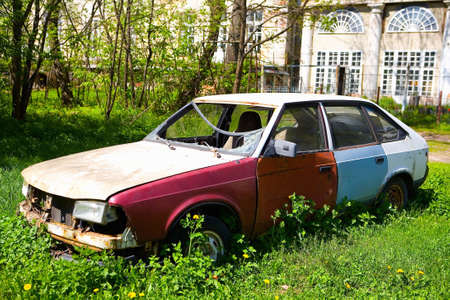 Disassembled abandoned car. Wreck of the car in the bushes. Abandoned old car