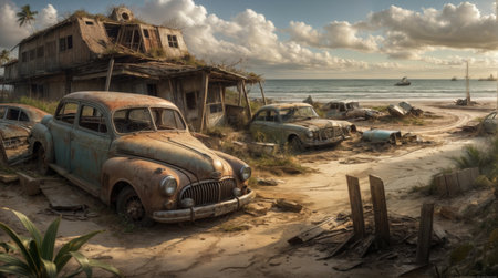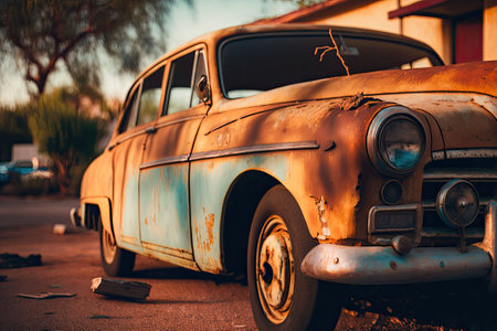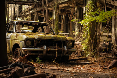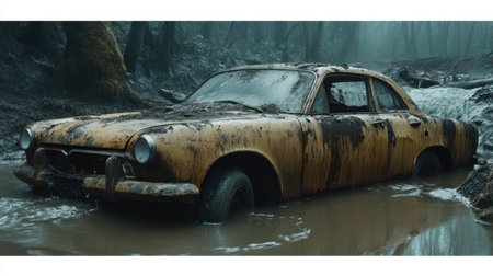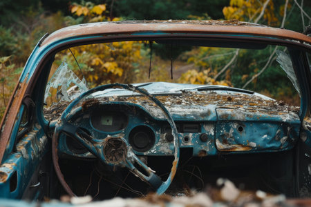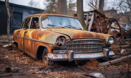 Rusty automobile in an abandoned landscape, a broken car telling its historic story. Generate AI