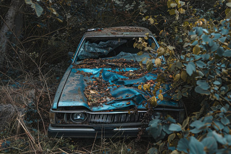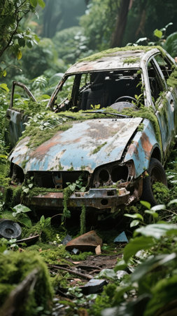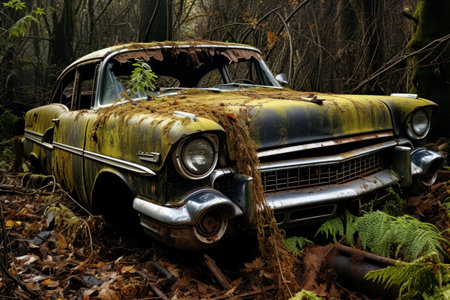 rusty abandoned cars covered in overgrown plants and vines, created with generative ai