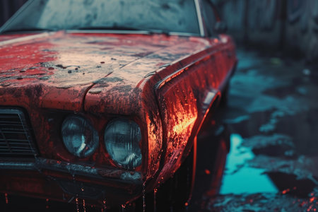Closeup of an old, red car with a textured rusty surface, showcasing a nostalgic vibe