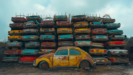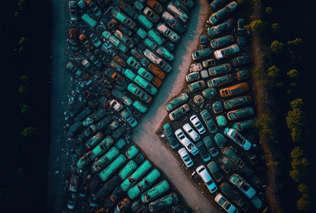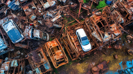 aerial view of stacked aged vehicles in junkyard, created with generative ai
