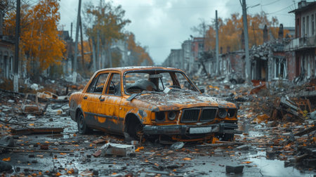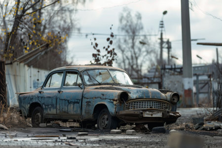 An old, rusted car sits abandoned in a desolate landscape, remnants of a bygone era