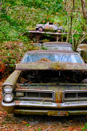 A Graveyard of Rusted Automobiles Awaiting Their Fate Nature Reclaiming Scrap Vehicles...