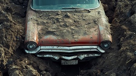This image features an abandoned car, partially buried in dirt, creating a striking contrast with the surrounding terrain. The scene captures a moment of decay and nature reclaiming man-made objects.