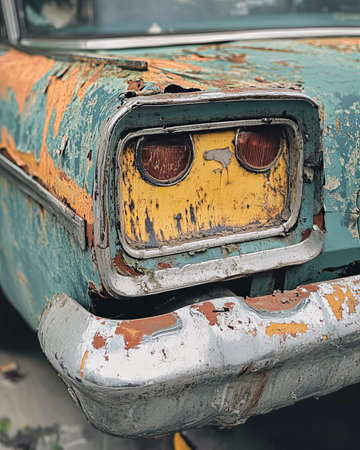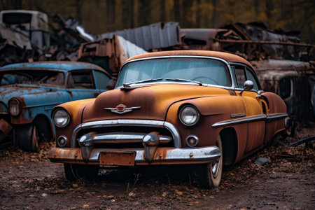 rusty car wreckage in a vintage junkyard setting, created with generative ai