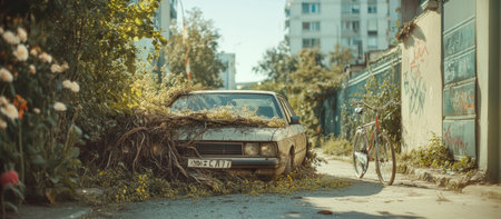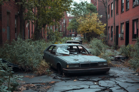 A deserted urban street showcases abandoned cars surrounded by overgrown plants. Cracked pavement reveals signs of neglect, highlighting the passage of time in this once bustling location.