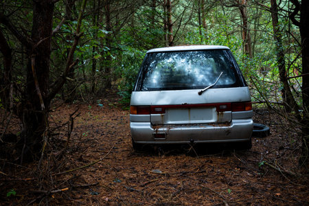 Rusty abandoned car overgrown with moss and vegetation in a dense forest