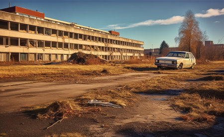 A solitary car stands in an empty parking lot, flanked by overgrown grass and industrial buildings under a dramatic cloudy sky, evoking a sense of abandonment.