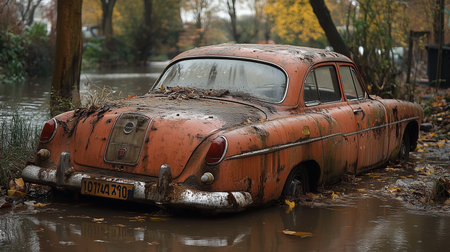 An old, rusted car partially submerged in muddy water amidst the eerie stillness of the Chornobyl region, capturing a moment of forgotten history.