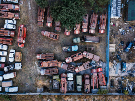 Old rusty broken Russian fire trucks for scrap metal, aerial view.