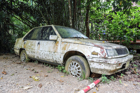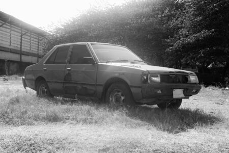 Old and shabby car's body reuse for decoration on stage in outdoor park and bright sky, Thailand.