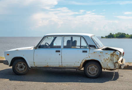 Kronstadt, St. Petersburg, Russia - July 20, 2020. Old car sedan with rusty and crumpled white body stands on the sea shore. Horizontal orientation, selective focus